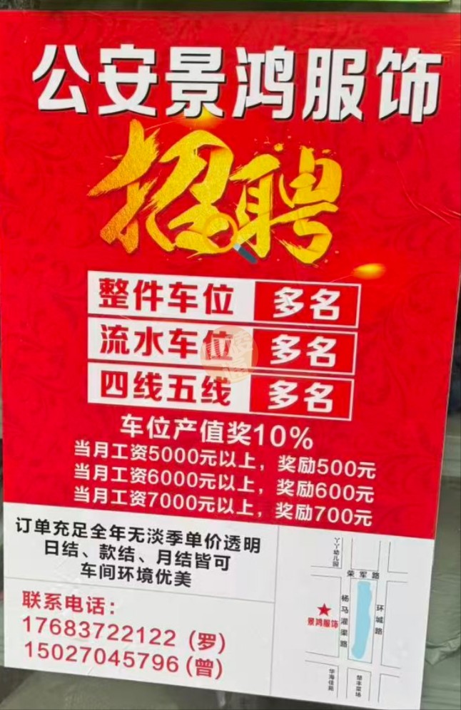 招聘 公安县欣盛服装 全职招聘 车工 面议
