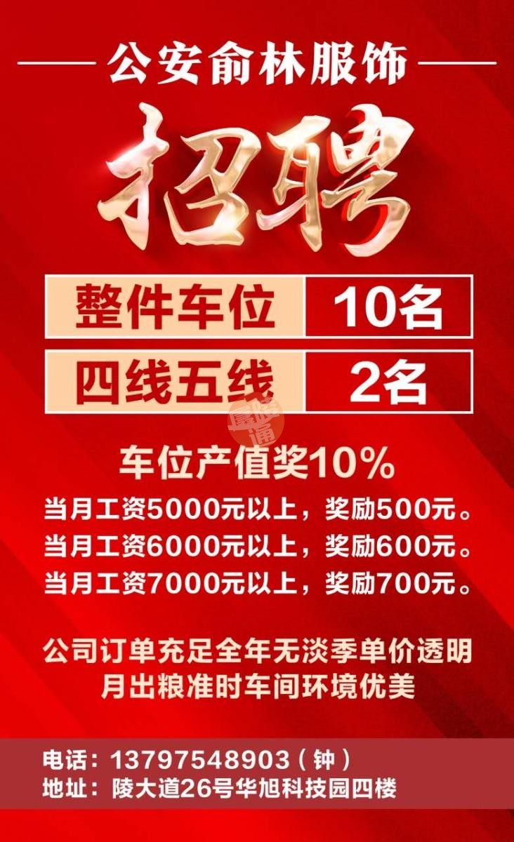 招聘 俞林服饰 全职招聘 车位 5000以上,